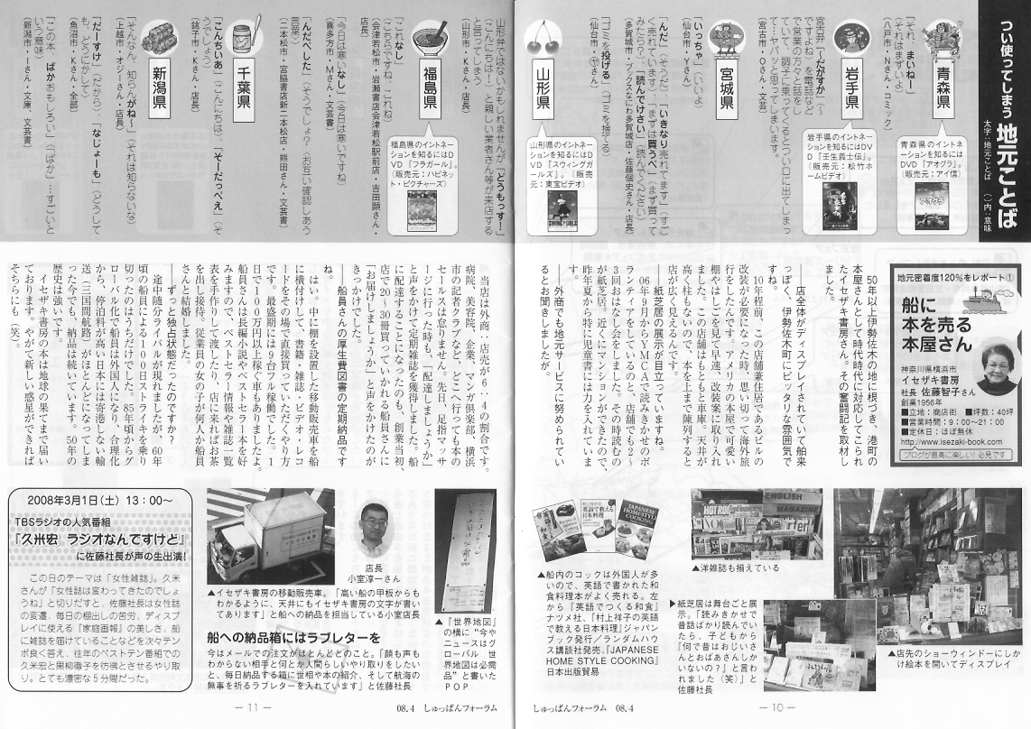 横須賀・横浜における半世紀以上にわたる書店業で船舶関連への販売というユニークな販売スタイルを構築。 アメリカの本屋に倣い壁面をすべて本棚で埋めるディスプレイにしたり、最近ではインターネットや紙芝居に力を入れていることを語りました(インタビュー形式)。 雑誌名:しゅっぱんフォーラム 2008/4 No.280 発行所:株式会社トーハン 掲載ページ:pp. 10-11 クリックすると読めます。 2008