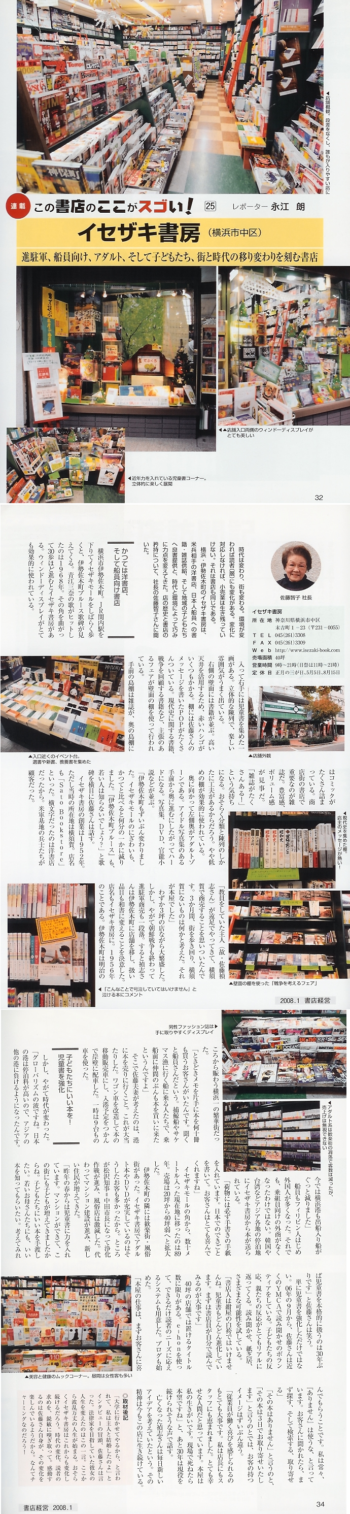 当店のブログから読み取れる、本や時世の話題に絡めて街の本屋が発するメッセージ、本屋という職業に対する思い、社会への貢献、読者を育てる気持ちなどがライターの岡部さんによって解説されています。 厳しい時代ではありますが、お客様にこれからも当店で素晴らしい本の数々と出会う楽しみを味わって戴けますよう、邁進して参ります! イセザキ書房をどうぞよろしく。 サイト名:セカンドステージ Second Stage 発行:日経BP社 BPNET 掲載ページ:大人のブログ探訪2/12 クリックすると読めます。 2008