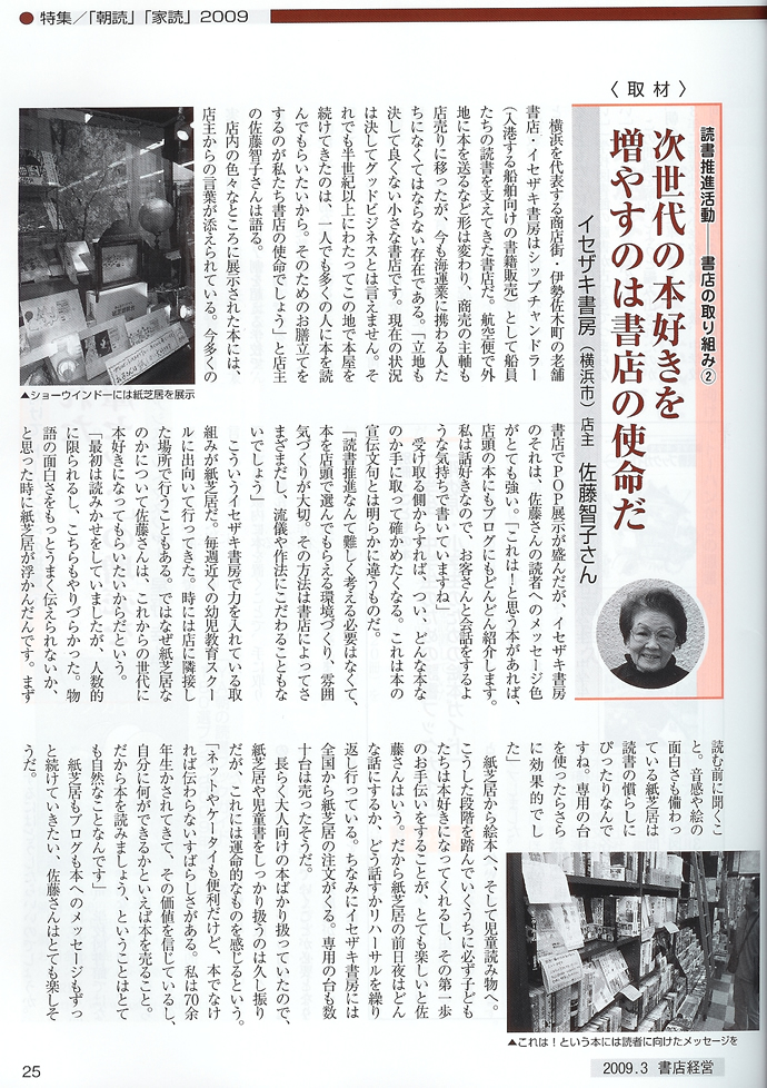 「書店は読書推進活動にどのように取り組むか」という副題の下、読書推進活動の取材先として当店が紹介されています。 当店名物のメッセージ発信型POP展示、次世代育成への取り組みとして紙芝居販売に力を入れている点、インターネットを駆使した紙芝居や絵本の全国通販、店主イチ押し本のブログにおける紹介などを掲載。 「紙芝居は音感や絵の面白さも手伝って(子どもたちの)読書の慣らしにはぴったりです。紙芝居から絵本、そして児童読み物へと進む内に子どもたちは必ず本好きになってくれる」 雑誌名:書店経営 MAR 2009 発行所:株式会社トーハン 掲載ページ:p. 25クリックすると読めます。 2009