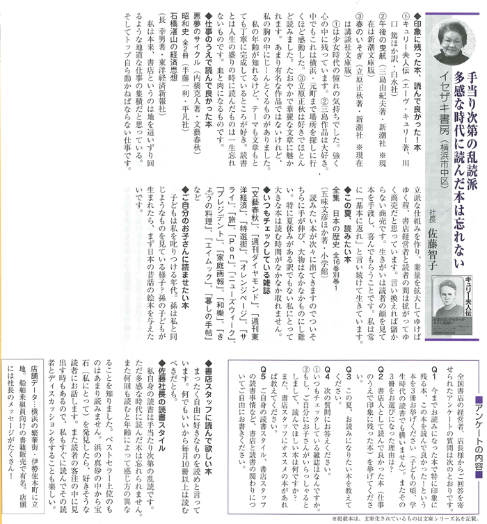 お客様の読書を支える書店の経営者、店長たちへの「読者事情アンケート」に当店の社長のインタビューが載りました。 「手当たり次第の乱読派。多感な時代に読んだ本は忘れない」 雑誌名:書店経営 AUG 2009 発行所:株式会社トーハン 掲載ページ:p. 54クリックすると読めます。 2009